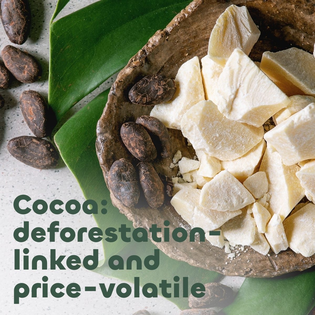 Cocoa is a tropical crop strongly concentrated in West Africa, and cocoa expansion has been repeatedly linked to deforestation and land-use change in key producing regions. That matters for beauty because cocoa butter pricing and availability are tightly coupled to the chocolate market and to agricultural volatility: weather extremes, disease pressure, and farm economics. When supply tightens, cosmetics competes with food for the same raw material pool.